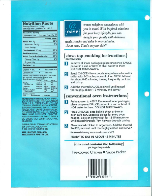 - 18-oz packages of “@ease Sweet Chili Chicken Meal Starter, Fully cooked, boneless, battered white meat chicken in a sweet chili sauce” with a “Best By” date of 5/17/2018 and UPC code of 36800-38348.